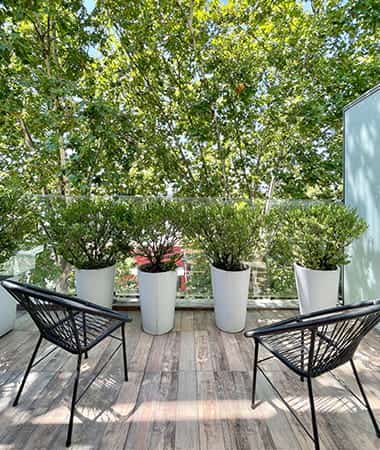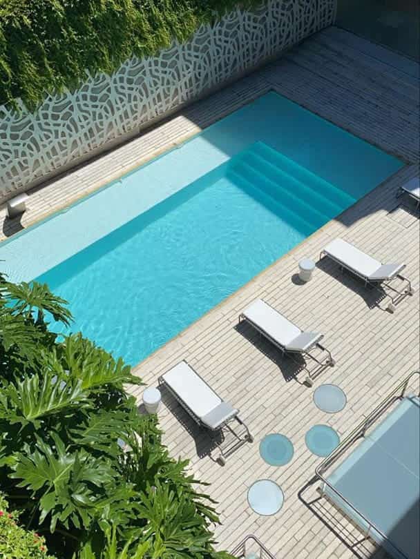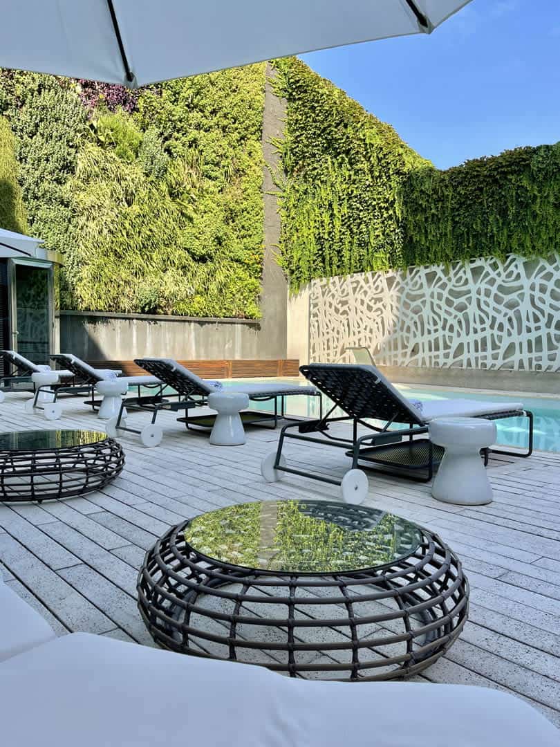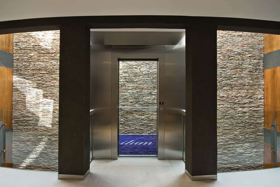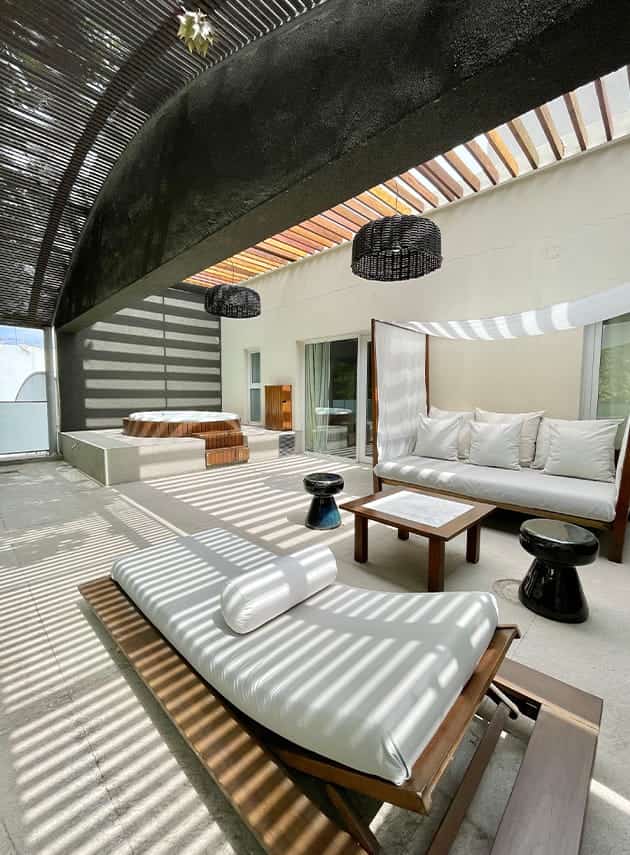 ambientes interiores y exteriores y el uso de elementos naturales como la piedra, el